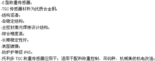 TSC稱重傳感器材料為優質合金鋼,長期穩定性好,應用于配料稱重控制、吊鉤秤、機械衡的機電改造等。(TSC weighing sensor material is high quality alloy steel, good long-term stability and application in the weighing control, hook scales, mechanical and electrical transformation of mechanical equilibrium, etc.)
